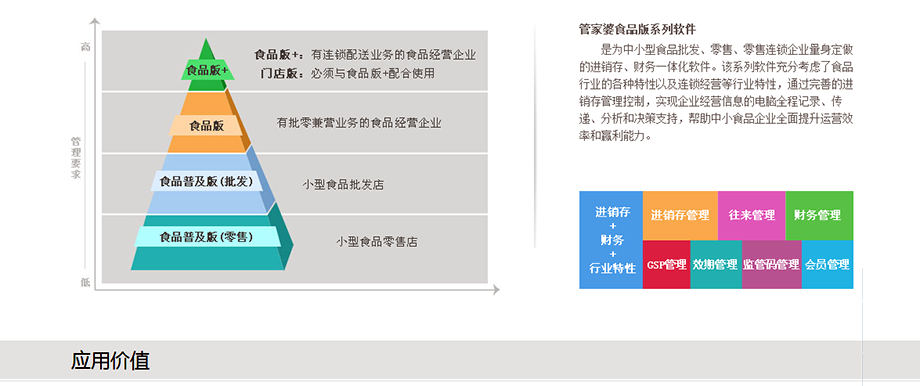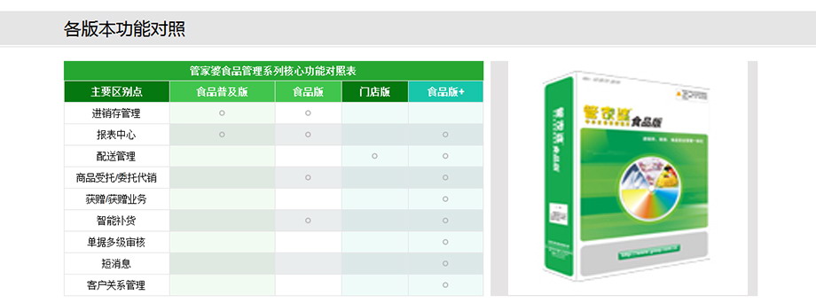 ![]() | 管家婆食品版系列软件是根据国家对食品安全监管的相关要求,结合国内广大食品流通企业的经营管理特点开发的食品企业专业管理软件。该系列软件集进销存、财务、食品安全管理于一体,帮助食品经营企业实现对采购、销售、存货等经营环节信息的全程记录、传递、跟踪和分析,从而实现企业物流、资金流、信息流和食品安全的全方位管理和监控,提升经营管理效率,规范食品经营行为。 |